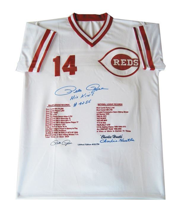 This limited edition embroidered jersey features the statistics of Pete Rose's baseball career with the Cincinnati Reds. Each jersey is hand-signed by Pete Rose.
