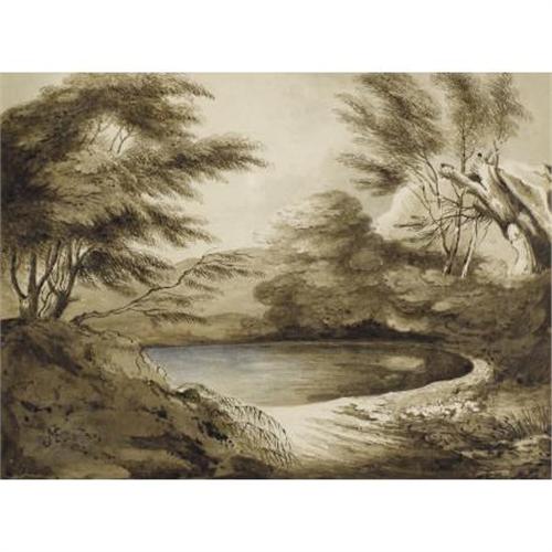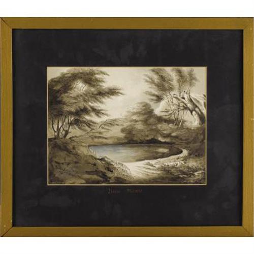 <B>JERVIS MCENTREE </B></I>(American 1828-1891)<BR><I>Landscape with Pond</B></I><BR>Ink and watercolor on paper<BR>8 x 10-1/2 inches (20.3 x 26.7 cm)<BR>Signed with monogram lower left<BR> <B>Condition Report:</B> <BR><BR><b>Shipping:</b> Requires 3rd Party Shipping (<a target="_blank" href="http://www.heritageauctions.com/common/shipping.php">view shipping information</a>)