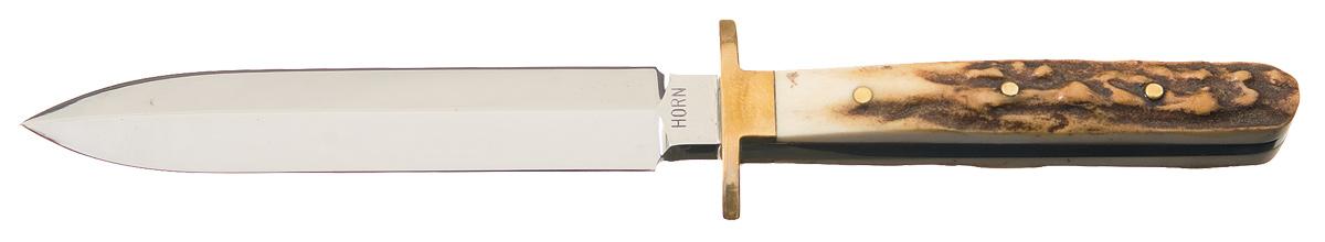 This boot knife was handcrafted by Jess Horn. Horn is famous for making folders but has made some special straight blade knives such as this example. This is an early knife made by Horn (circa 1968 or 1969) when he was just beginning in the knife making business. The knife has a 5 inch blade marked "HORN" on the ricasso. Brass guard with stag scales secured with three rivets. Jess Horn has now stopped taking orders and his knives are becoming extremely hard to find. OAL: 8 7/8"