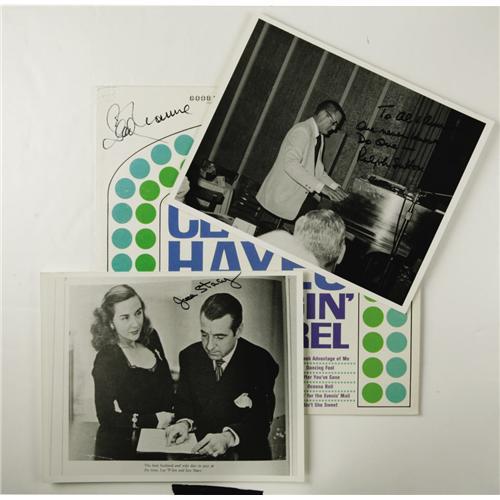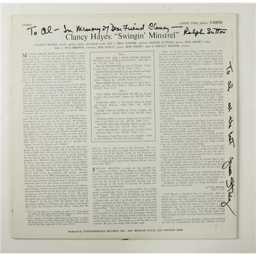 <B>Jess Stacy and Ralph Sutton Signed Record and Photo Group.</B></I> Two jazz piano maestros share the spotlight in this lot. Included are: "Clancy Hayes: Swinging Minstrel" (Good Time Jazz S 10050) with its cover signed by Jess Stacy and Ralph Sutton (and two signed photos of Stacy and Sutton). <I>From the Al White Jazz autograph archive.</B></I><BR><BR><b>Shipping:</b> Recordings (<a target="_blank" href="http://www.heritageauctions.com/common/shipping.php">view shipping information</a>)