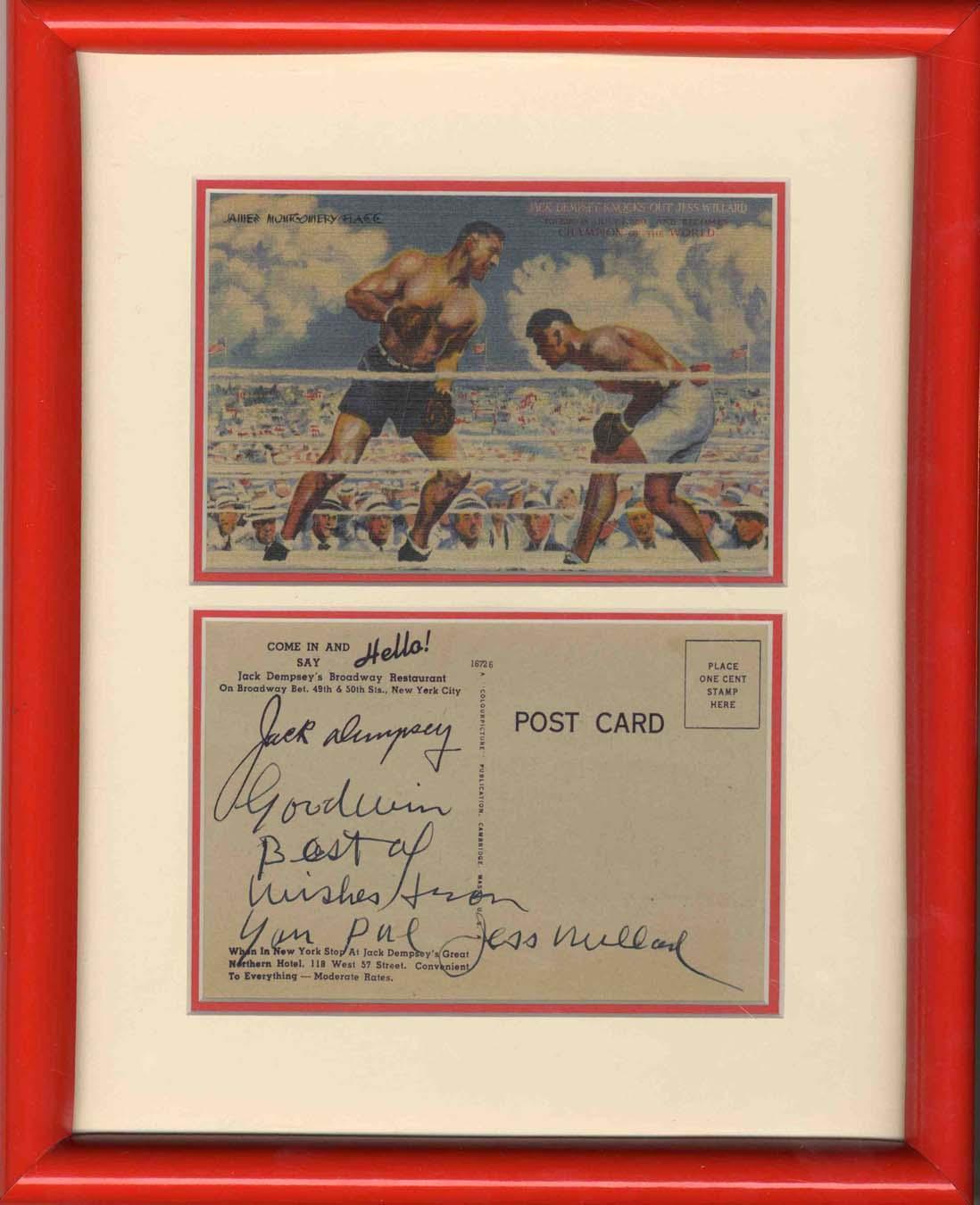 Here, Jess Willard graciously signs a souvenir postcard from Jack Dempsey's Broadway Restaurant showing Dempsey knocking out Willard. Inscribed in ink on the verso, ''Goodwin / Best of wishes from your pal Jess Willard.'' Lot includes two of the postcards framed together -- the first, showing the bout, is framed above the signed verso. Each postcard measures 3'' x 5'', displayed in a 9'' x 11'' frame. Light smudge to Willard's signature, else fine. With JSA COA.