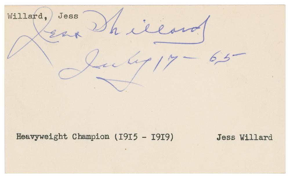 Boxing Hall of Famer (1881-1968) and former world heavyweight champion. Ballpoint signature, “Jess Willard, July 17 – 65,” on a 5 x 3 off-white card, with collector’s typed notations to top and bottom. In fine condition.
