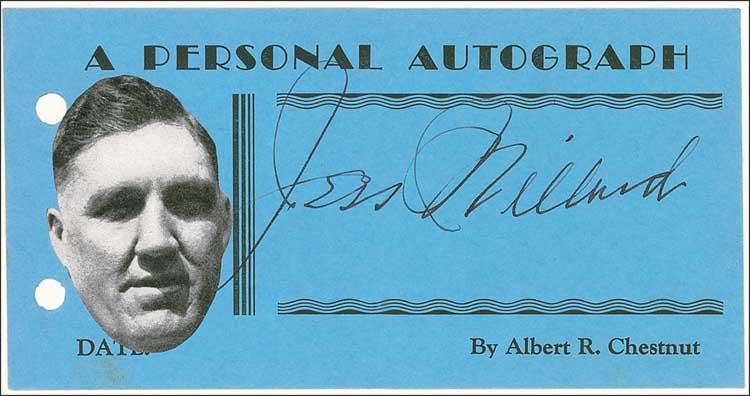 Heavyweight boxing champion of the world, 1915-1919. Vintage fountain pen signature, “Jess Willard,” on a 5.5 x 2.75 blue card from the Albert R. Chestnut collection. In fine condition, attached to a slightly larger white card, with a small photo attached to the left blank area (slightly overlapping the tail of the “J”). From his Pennsylvania home, Chestnut, a printer by profession, began collecting autographs in 1935. He sent these personally-printed cards to over a thousand celebrities and received favorable replies from the vast majority, finally retiring from collecting to raise his family when postage increased from 2¢ per card! Pre-certified Steve Grad/PSA/DNA and RRAuction COA.