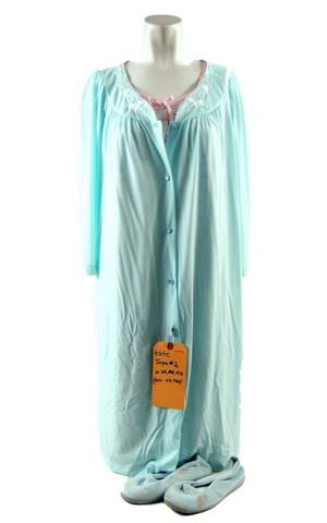 Kate (Joelle Carter) screen worn for the video tape #2, hero, blue short sleeve polyester with blue embroidery at the chest snap button front robe, white cotton short sleeve knee length with pink rose pattern 'Eileen West' nightgown, (size S) and blue velour 'Dearfoam' slippers. (size S) Includes wardrobe tag!