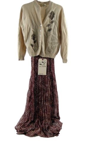Kate (Joelle Carter) screen worn for the video tape #3, hero, cream wool with floral embroidery 'Dalton' vintage cashmere cardigan sweater, pink, red, and cream spaghetti strap with empire waist and pleated skirt '12th St. by Cynthia Vincent' dress, (size 0) Includes wardrobe tag!