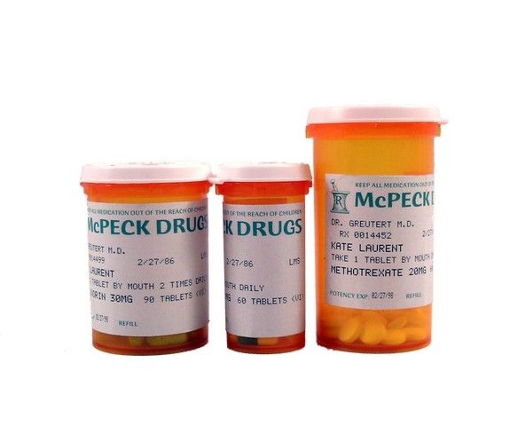 Kate (Joelle Carter) screen used, hero, three orange and white pill bottles with labels on the outside.