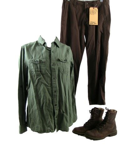 Moses (Vaughn Wilson) screen worn, hero, green long sleeve button front with patch pockets on the chest 'Old Navy' shirt, (size M) brown flat front with hole on the shin 'Old Navy' pants, (size 31 x 30) and brown lace up the front with zipper on the side 'Durango' boots. Includes wardrobe tag!