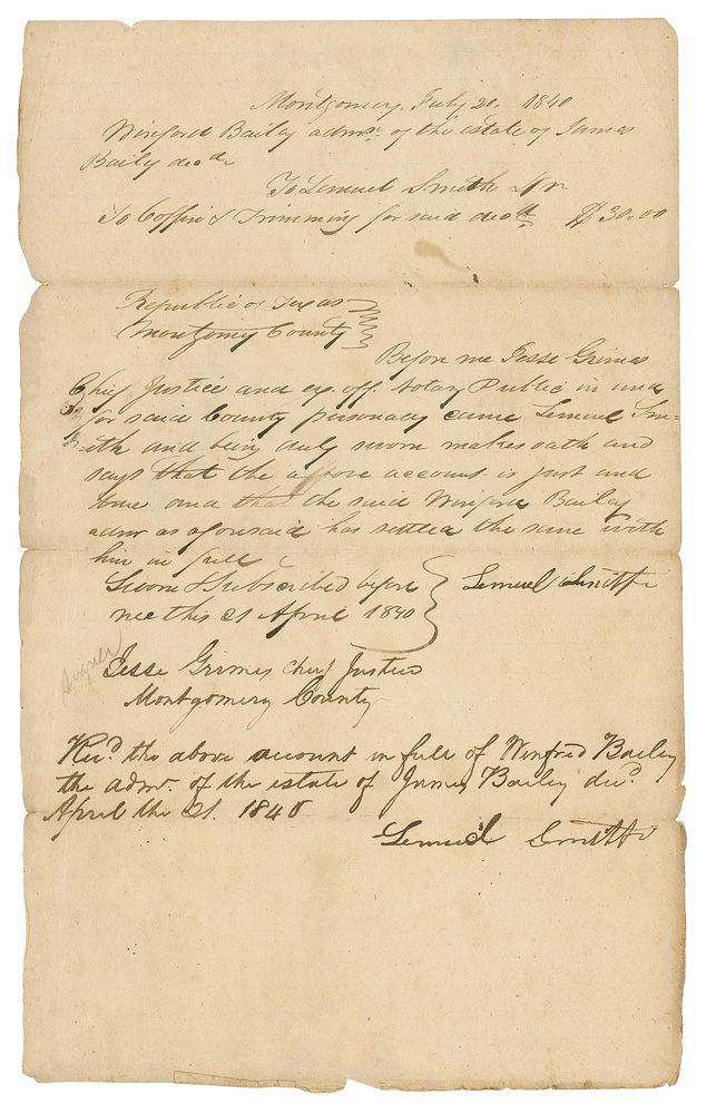 Texas pioneer and politician (1788–1866) and signer of the Texas Declaration of Independence. Manuscript DS, signed “Jesse Grimes, Chief Justice Montgomery County,” one page, 8 x 12.5, April 21, 1840. Republic of Texas legal document reads, in part: “Before me Jesse Grimes, Chief Justice and…Notary Public in and for said County personally came Lemuel Smith and being duly sworn makes oath and says that the afore account is just and true and that said Winford Bailey adm as aforesaid has settled the same with him in full.” Written at the top in another hand, “Winford Bailey admns of the estate of James Bailey decd to Lemuel Smith to Coffin and Trimming for said decd $30.00,” with an endorsement of Smith at the bottom of the page. A couple small separations along horizontal folds, scattered toning and creasing, edge wear, and a pencil notation next to Grimes’s signature, otherwise very good condition. The Robert Davis Collection.