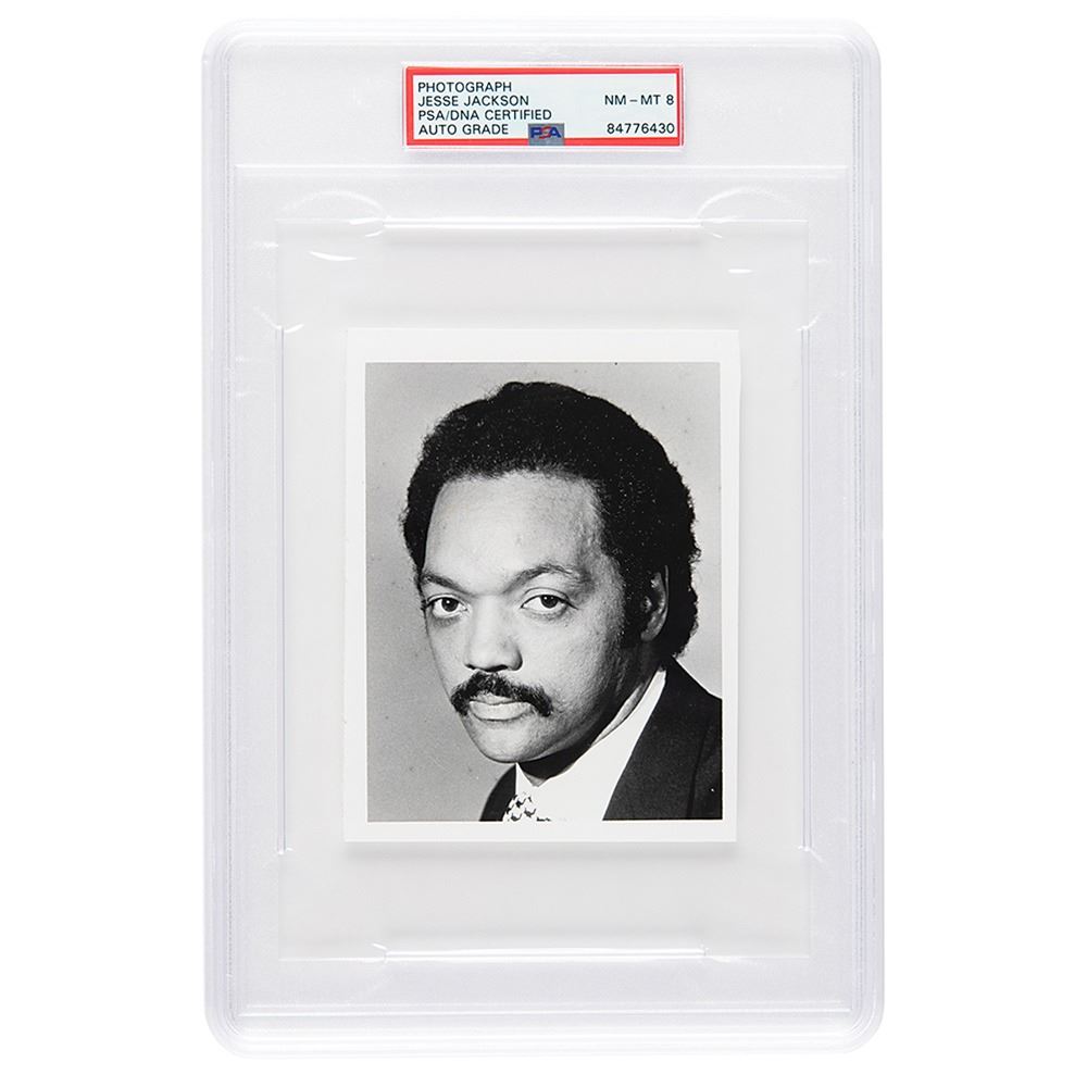 Glossy 3.75 x 5 portrait photo of a young Reverend Jackson, signed on the reverse in black ballpoint, "Peace & amp; freedom, Jesse Jackson." In fine condition. Encapsulated and graded by PSA/DNA as "NM-MT 8."
