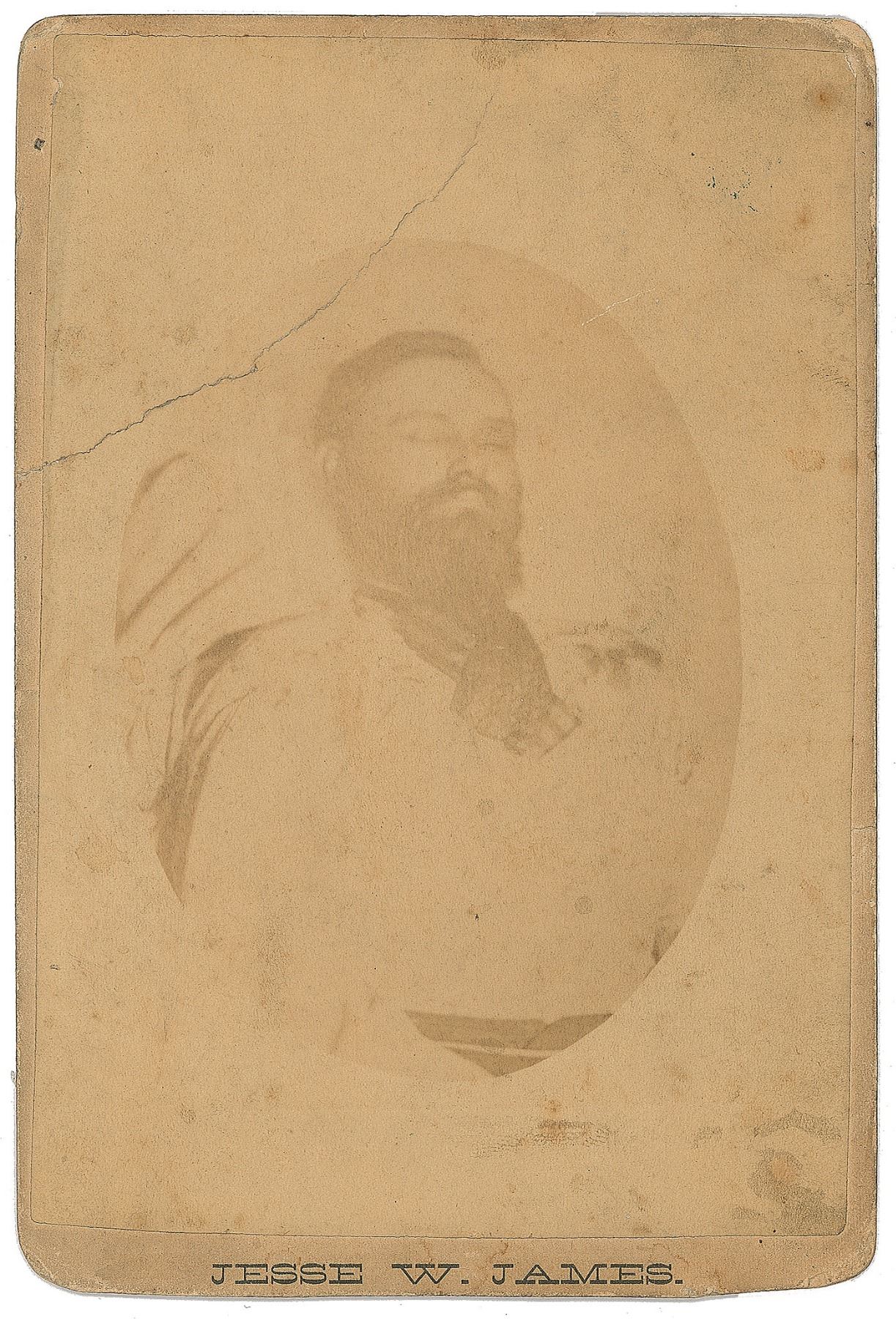 Incredibly rare 4.25 x 6.25 postmortem cabinet portrait of Jesse James, originally taken by photographer Rudolph Uhlman at McFadden's St. Joseph mortuary in 1882. In very good condition, with moderate soiling and light staining to front and back, four old small pieces of clear tape on the reverse, and a crease to the upper left not affecting James's somewhat faded image. Death photos of Jesse James remain extremely rare and highly sought-after by collectors.