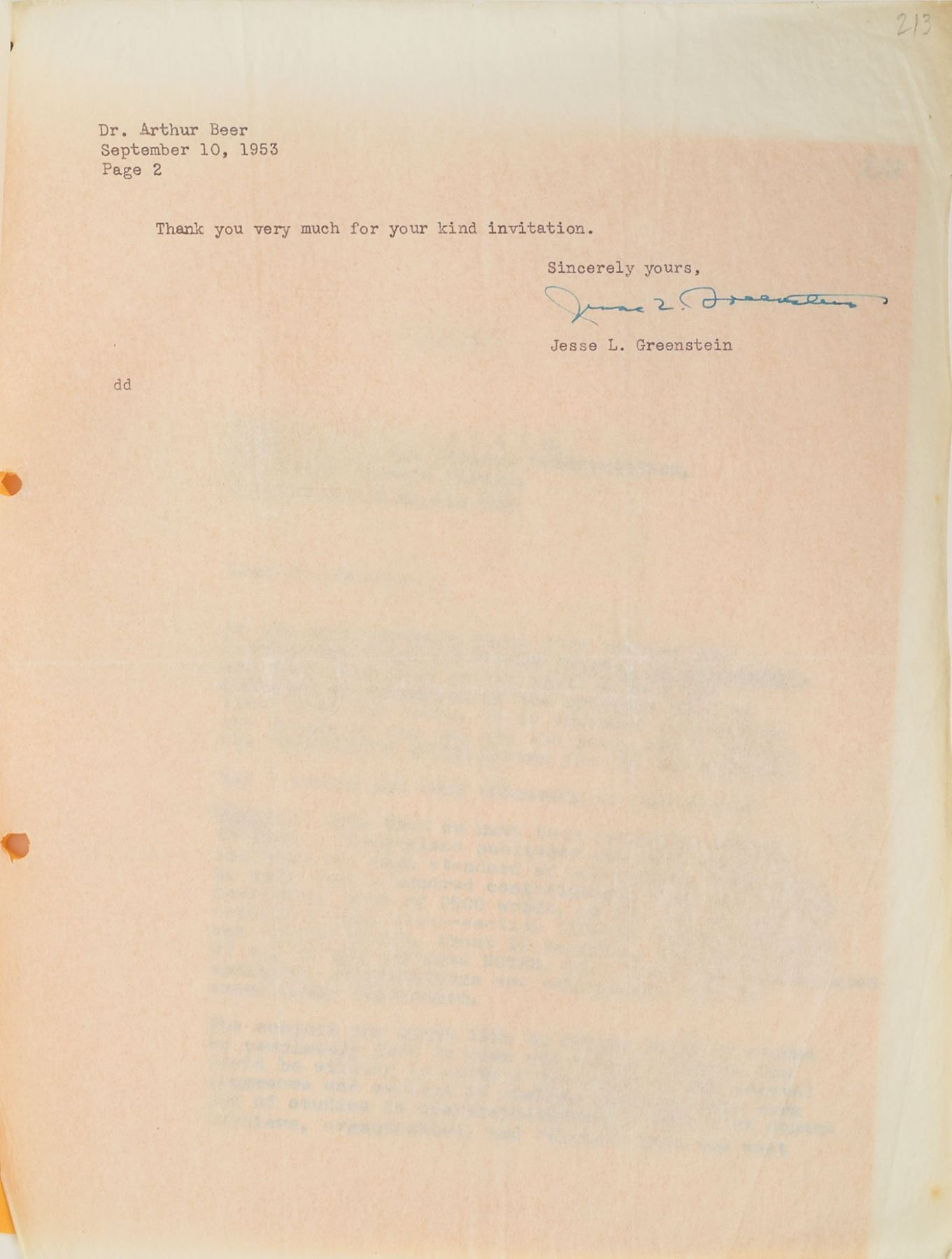 American astronomer (1909–2002) who studied under Donald H. Menzel and Fred L. Whipple at Harvard, developed a new spectrograph and a wide-field camera with Louis G. Henyey, and was director of the astronomy program at Caltech. He also did important work determining the abundances of elements in the stars and recognized quasars as compact, distant sources as bright as a galaxy. Collection of correspondence between Jesse L. Greenstein and Cambridge astronomer Arthur Beer, comprising eight letters by Greenstein (seven TLSs and one ALS), along with thirteen of Beer's retained carbon copies and drafts, dating from 1953–1959. In the letters, they discuss arrangements for visits and lectures, illustrations for Beer's publication entitled "Vistas in Astronomy," potential articles on astronomical spectrophotometry, and a collaboration with Leverett Davis, Jr. In overall fine condition.