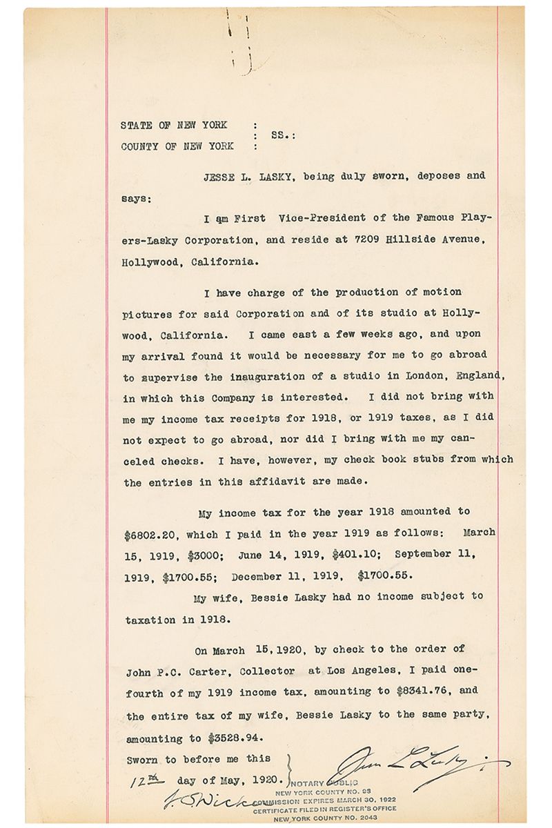 Notarized DS, signed “Jesse L. Lasky,” one page, 8 x 13, May 12, 1920. Deposition regarding Lasky’s income tax in 1918 and 1919. In part: “I am First Vice-President of the Famous Players-Lasky Corporation…I have charge of the production of motion pictures for said Corporation and of its studio at Hollywood, California. I came east a few weeks ago, and upon my arrival found it would be necessary for me to go abroad to supervise the inauguration of a studio in London, England, in which this company is interested. I did not bring with me my income tax receipts for 1918, or 1919 taxes, as I did not expect to go abroad, nor did I bring with me canceled checks. I have, however, my check book stubs from which the entries in this affidavit are made…My income tax for the year 1918 amounted to $6802.20…My wife, Bessie Lasky had no income subject to taxation in 1918.” Signed at the conclusion by Lasky and countersigned and stamped by a notary. A uniform shade of toning, light creasing throughout, and a rusty paperclip mark to the top, otherwise fine condition.