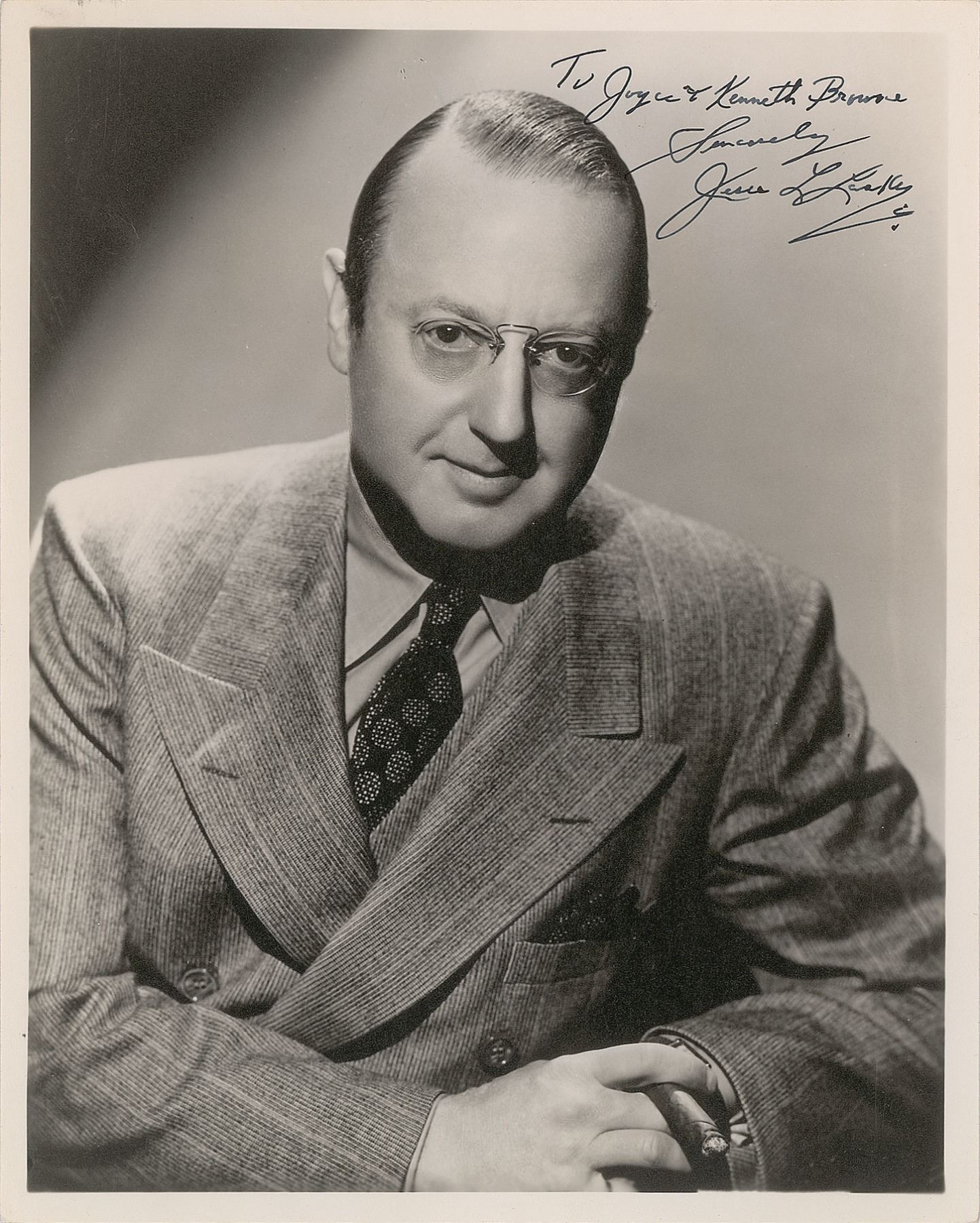Founder of Paramount Pictures and pioneering Hollywood producer (1880–1958). Vintage matte-finish 8 x 10 studio portrait of Lasky holding a cigar in a half-length pose, signed and inscribed in fountain pen, "To Joyce & Kenneth Browne, Sincerely, Jesse L. Lasky." In fine to very fine condition.