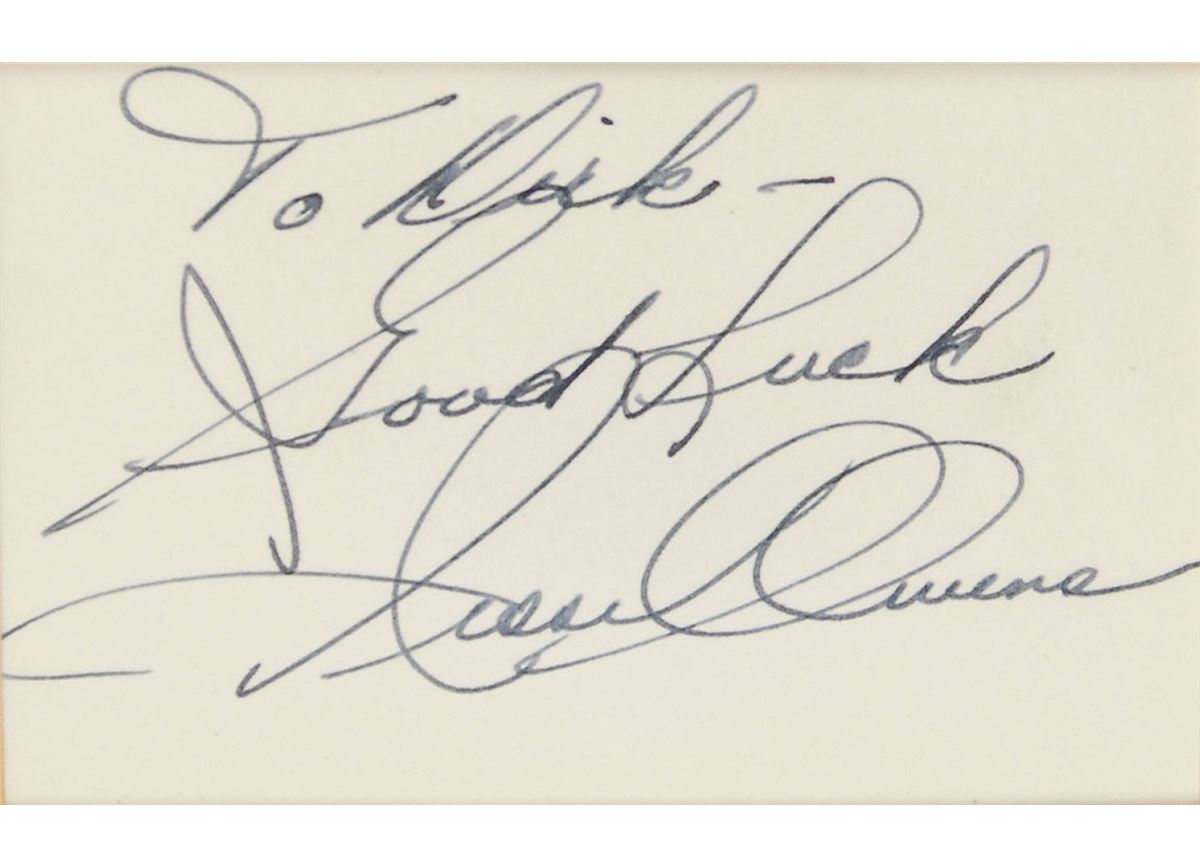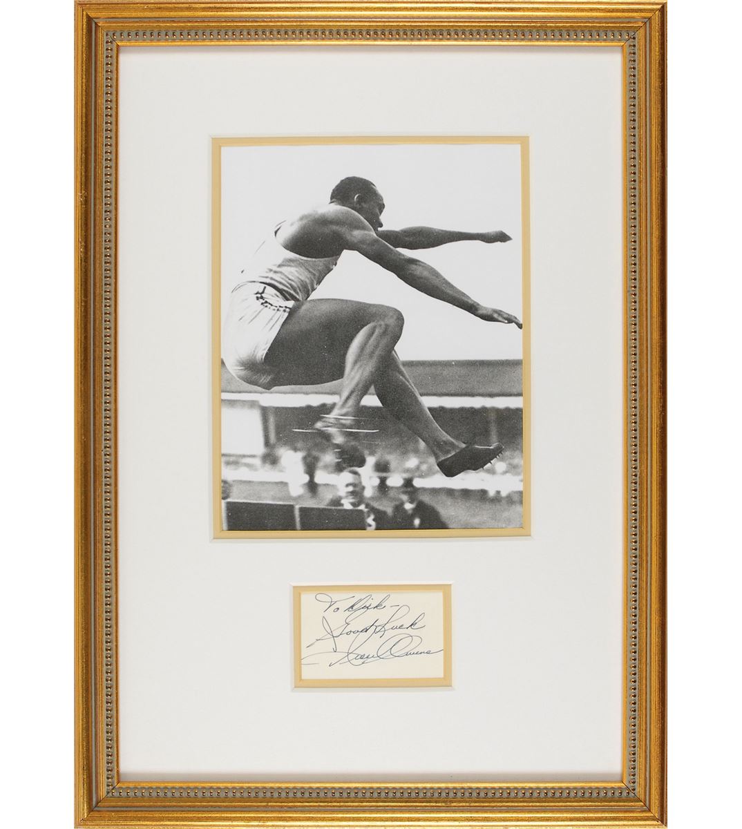 Bold ink signature, “To Dick–Good Luck, Jesse Owens,” on an off-white 3.25 x 2 slip. Attractively double-matted and framed with a striking image of Owens captured in midair to an overall size of 14 x 19.5. In fine condition.