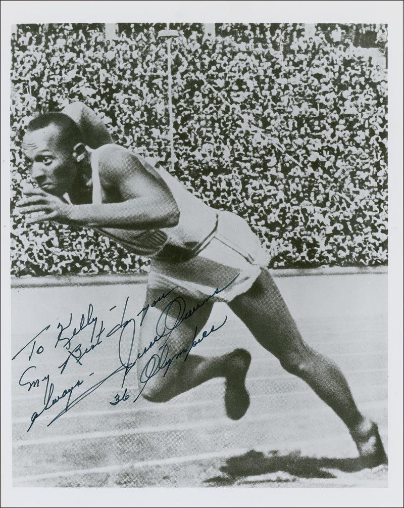 Glossy 8 x 10.25 photo of Owens in action, signed and inscribed in black felt tip “To Kelly—My best to you always—Jesse Owens, 36 Olympics.” In fine condition, with a few surface marks touching the side of his face and arm.