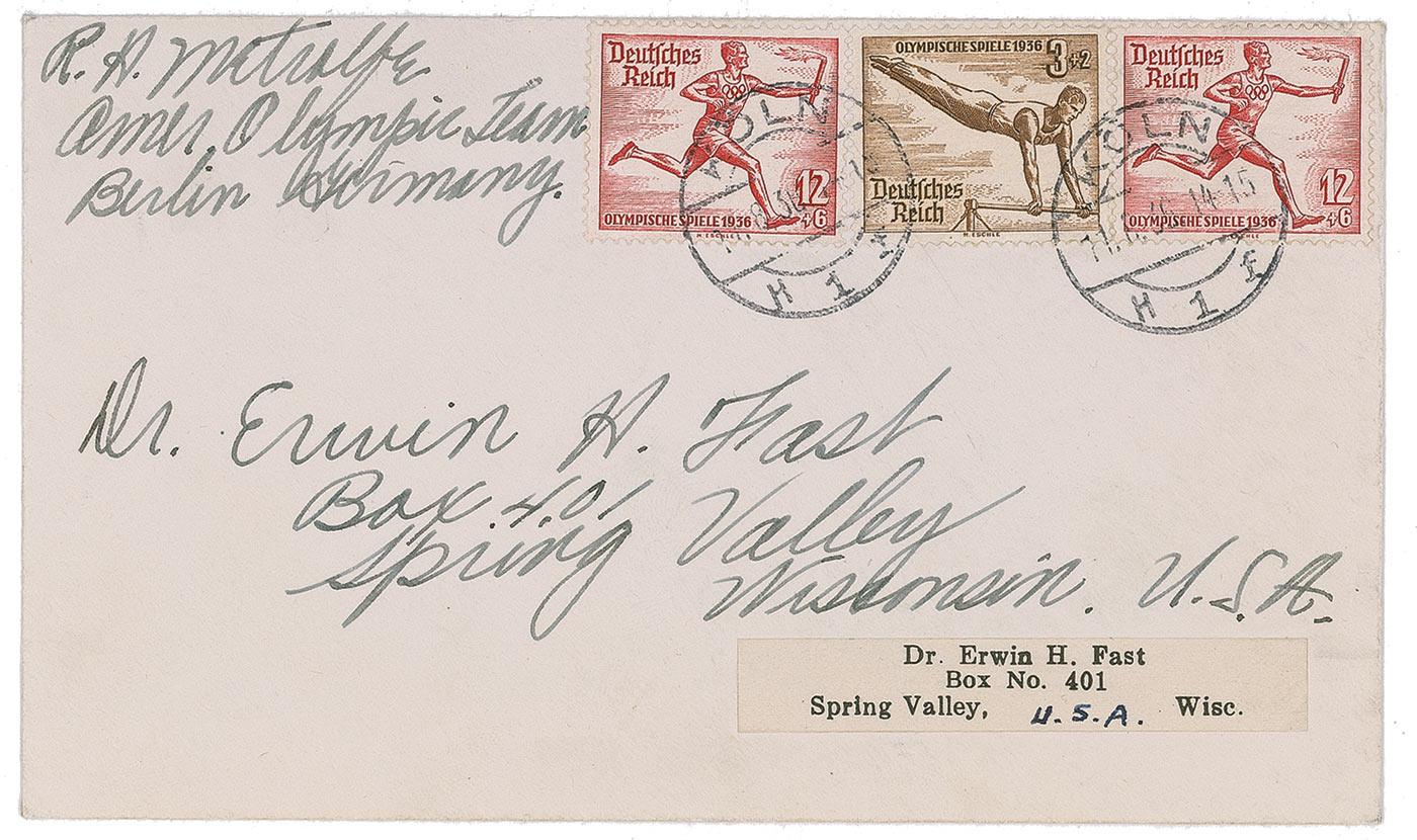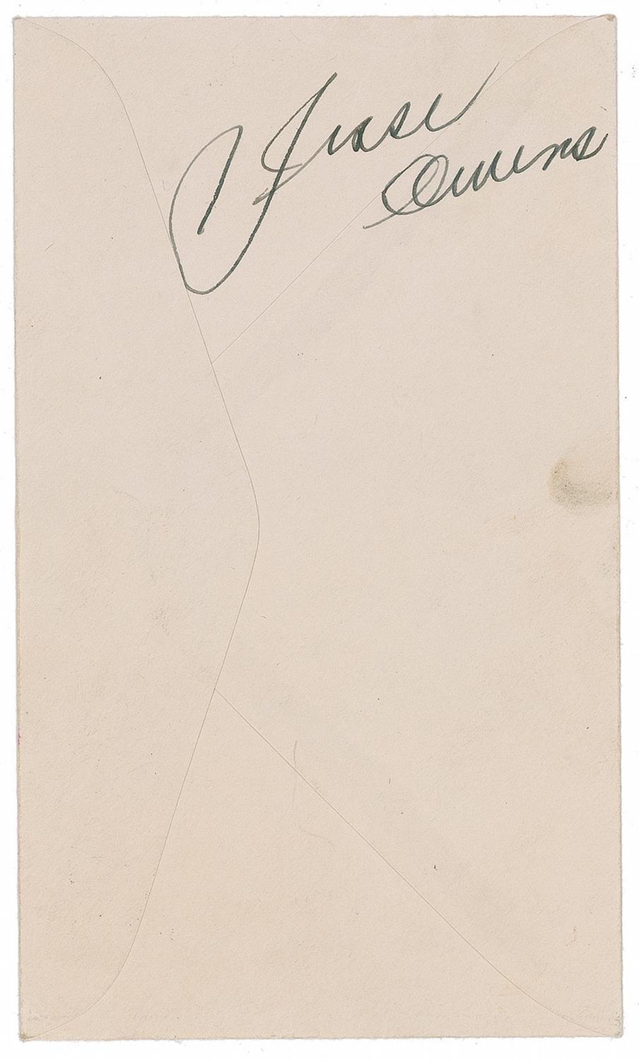 Vintage fountain pen signature, “Jesse Owens,” on the reverse of a 3.5 x 6 envelope. The front also has been hand-addressed and signed in the return address area by Ralph Metcalfe (signed “R. H. Metcalfe, Amer. Olympic Team, Berlin Germany). The envelope bears three stamps commemorating the 1936 Berlin Olympics and was postmarked in Koln, Germany on August 11, 1936, while the Olympics were still going on. Owens and Metcalfe were teammates, respectively taking the gold and silver medals in the 100-meter race. In fine condition, with a spot of soiling well below Owens’ name, and an adhesive address label on the front.
