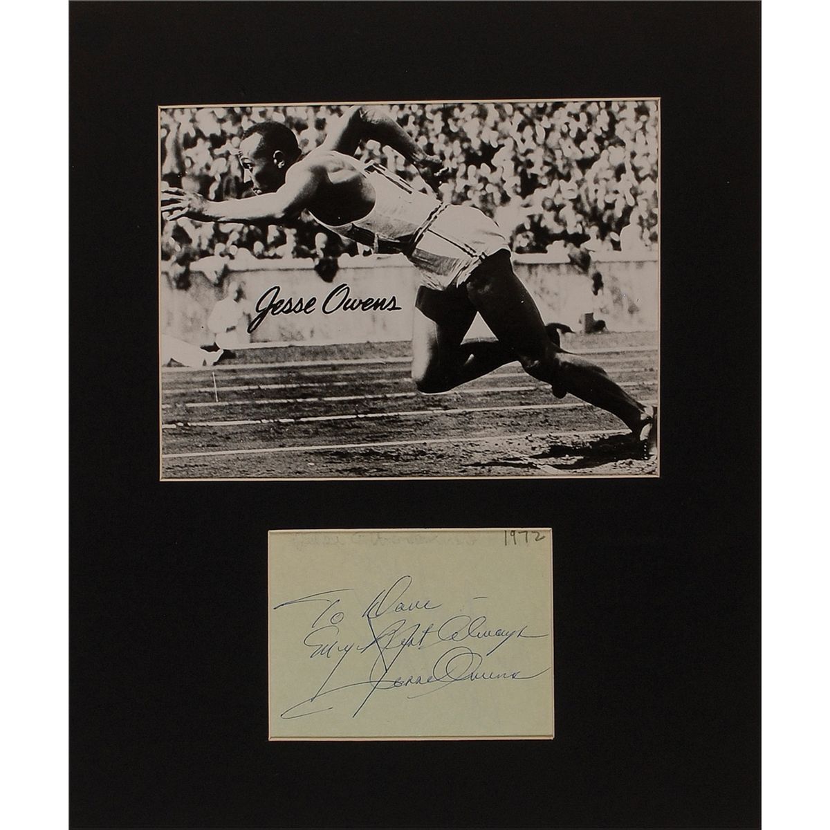 Ballpoint signature and inscription, “To Dave—Every Best Wish, Jesse Owens,” on a light green 5.25 x 4 album page. Matted with a glossy, unsigned photo of Owens sprinting to an overall size of 13 x 15.75. In fine condition, with a pencil notation in another hand in the top right corner, and show-through from writing on the reverse.