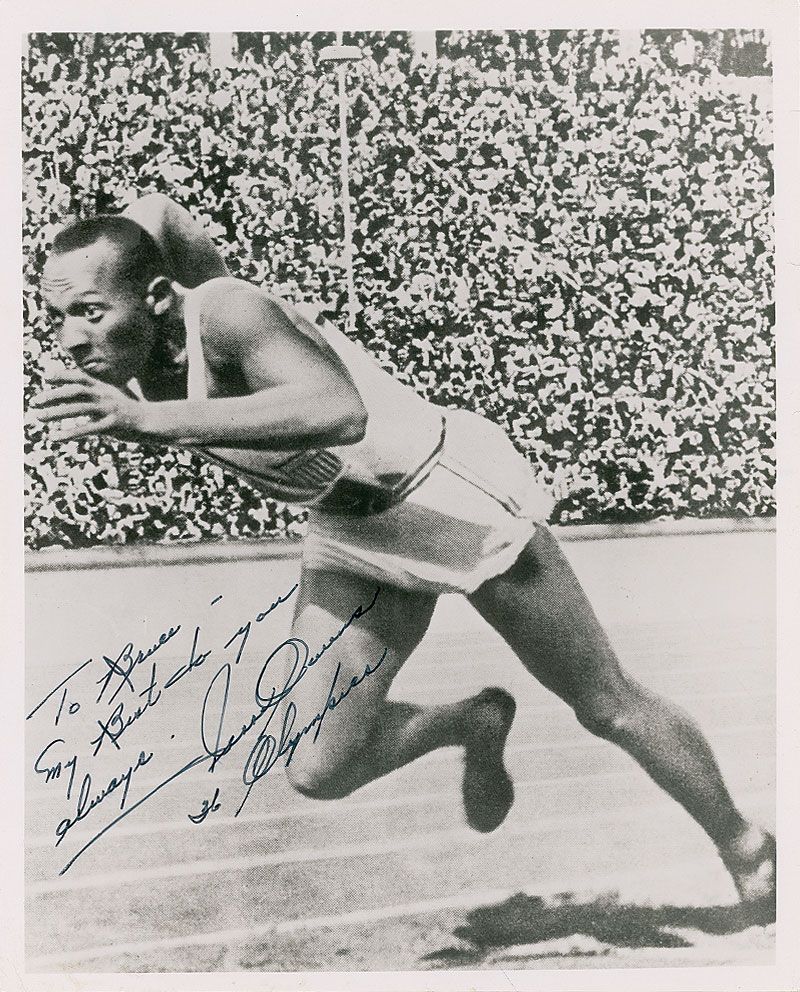 Glossy 8 x 10 photo of Owens bolting out of the starting blocks, signed and inscribed in black felt tip “To Bruce—My best to you always, Jesse Owens 36 Olympics.” Scattered creases, surface marks, and impressions, otherwise fine condition.