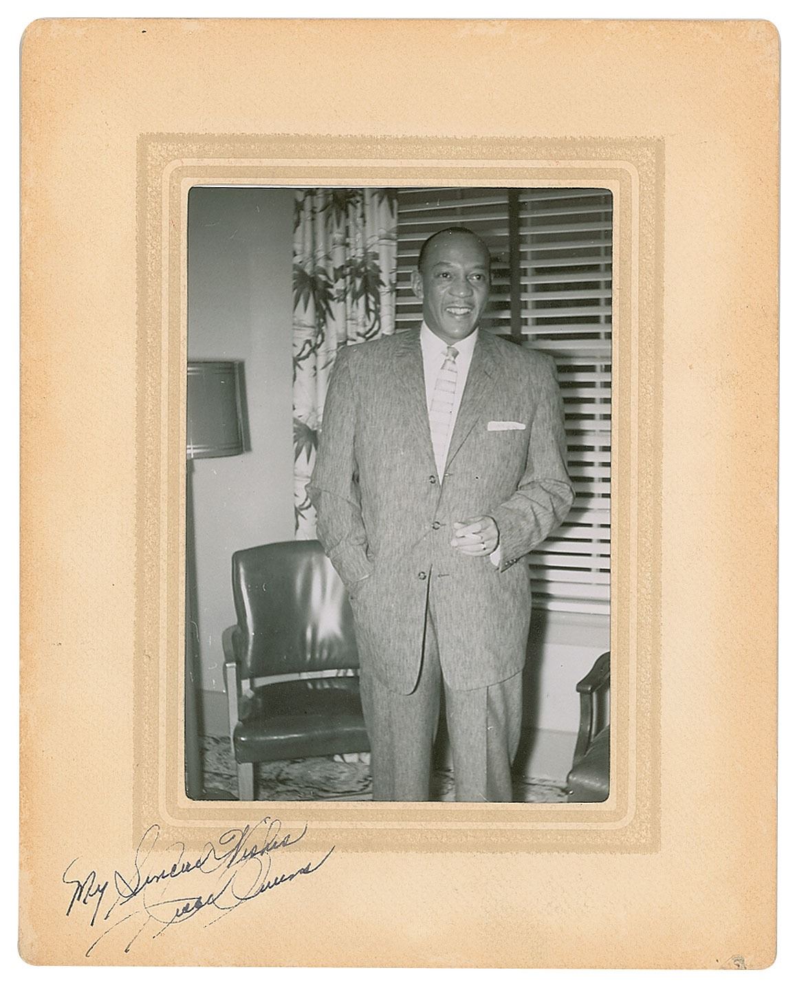 Vintage glossy 4.5 x 6.5 photo of Owens in a suit and tie, displayed in an 8 x 10 mat, signed on the mat in fountain pen, "My Sincere Wishes, Jesse Owens." Reverse bears a typed collector's label indicating that it was obtained on March 27, 1956. In very good to fine condition, with light toning, and a small ding to the lower edge of the mat.
