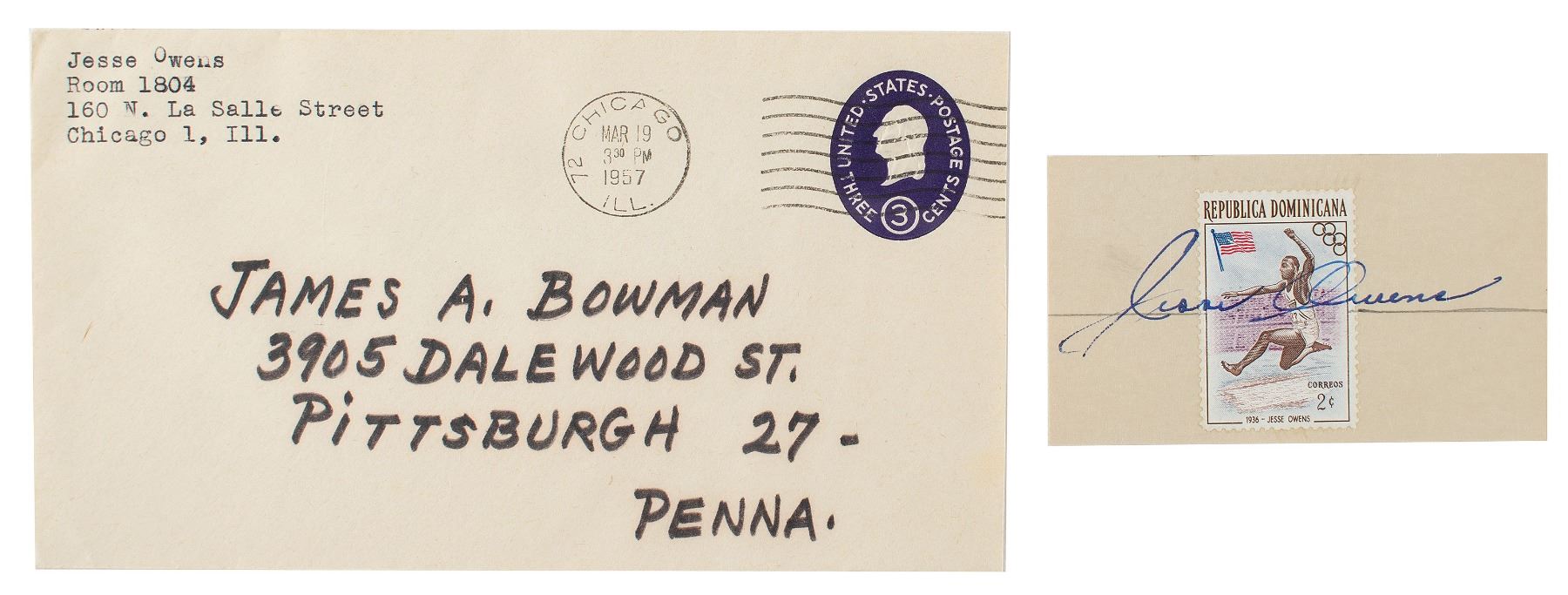 Vintage fountain pen signature, "Jesse Owens,” over a postage stamp honoring him from the Dominican Republic affixed to an off-white 3.5 x 2 card. In fine condition. Accompanied by the original mailing envelope, postmarked in Chicago on March 19, 1957.