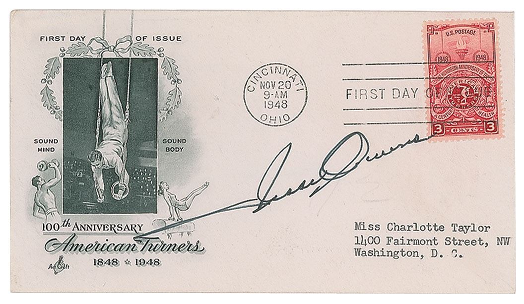 FDC with a cachet honoring American Turners, signed in black felt tip by Jesse Owens. In fine condition, with evidence of pencil writing erasure below the signature.