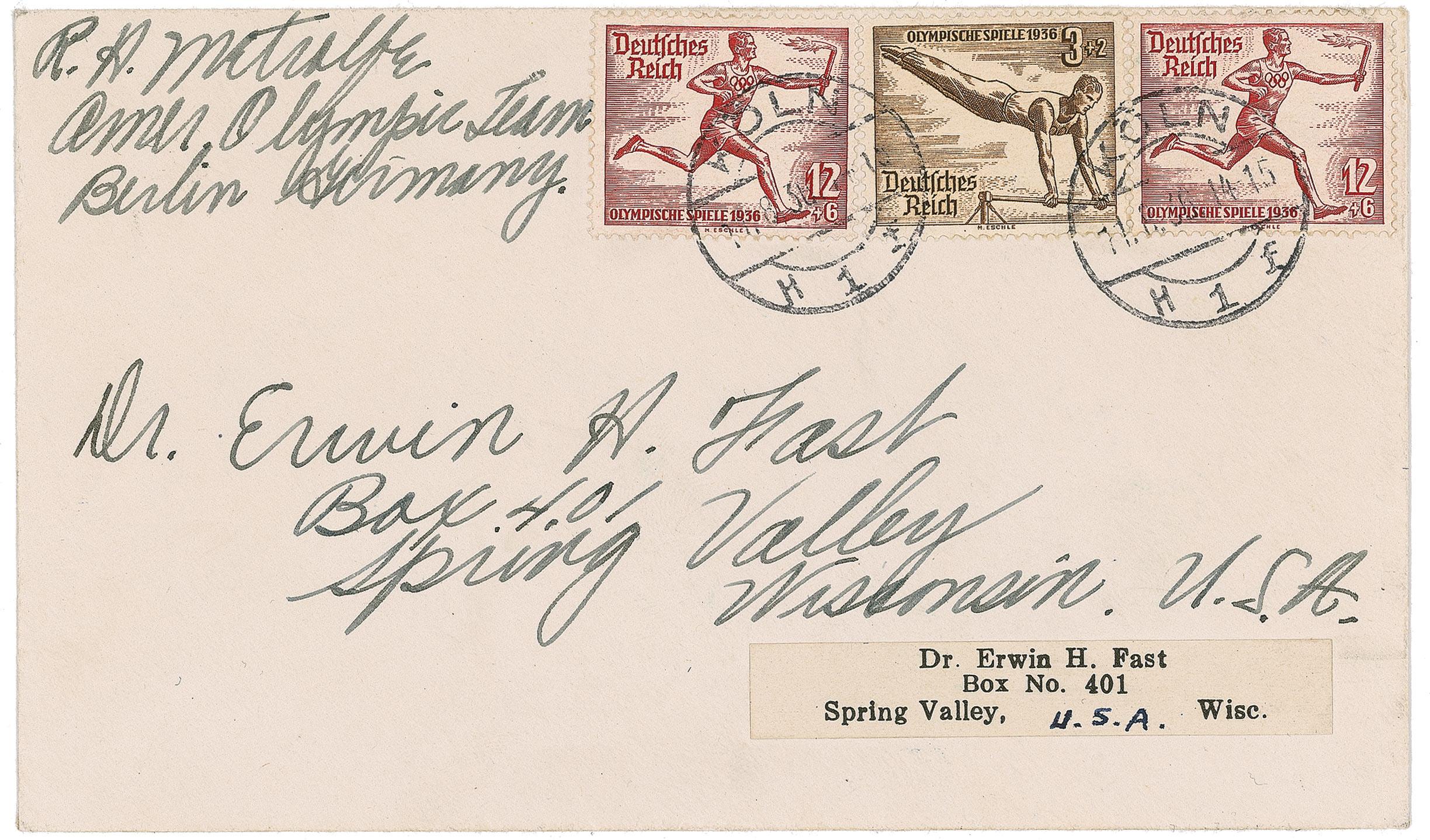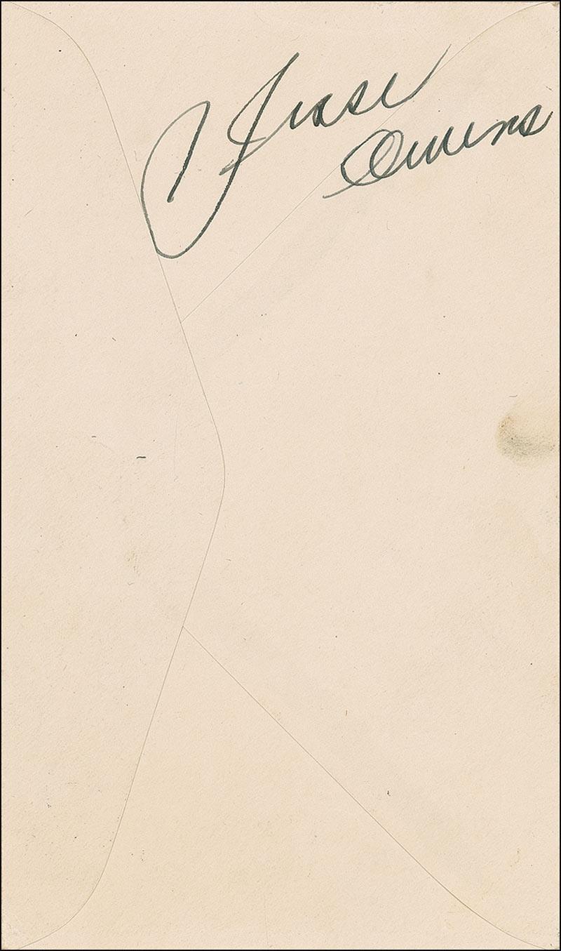 Mailing envelope, 6.5 x 3.5, postmarked from Berlin on August 11, 1936, addressed in the hand of Ralph Metcalfe, Owens’s teammate, to a doctor in Wisconsin, with a return address for R. A. Metcalfe in the Berlin Olympic village, signed on the reverse of the envelope in fountain pen by Owens. In fine condition, with a small spot to reverse of envelope. Pre-certified Steve Grad/PSA/DNA and RRAuction COA.