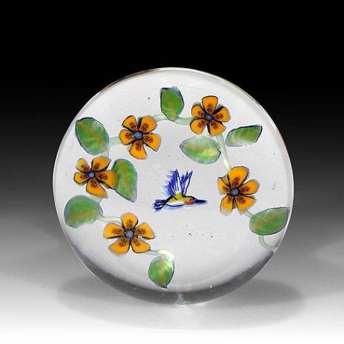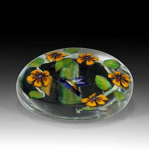 Jesse Taj Glass "Hummingbird and Flowers" small paperweight. The low-domed piece contains a hummingbird, surrounded by a curved vine of golden-yellow flowers and green leaves, on clear ground. Diameter 2 1/4".
