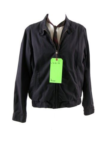 Preston (Mark Webber) screen worn, hero, navy blue zipper front long sleeve 'Eddie Bauer' jacket, (size M) and red and black stripe thin neck tie. Includes wardrobe tag!