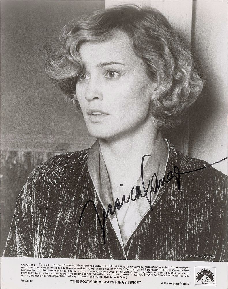 Glossy 7.75 x 10 Paramount Pictures publicity photo of Lange as Cora Smith from the 1981 film The Postman Always Rings Twice, signed in black felt tip. Reverse bears an affixed publicity caption. In fine condition, with scattered light creasing. From the Harvey and Rhoda Kuflik Collection.