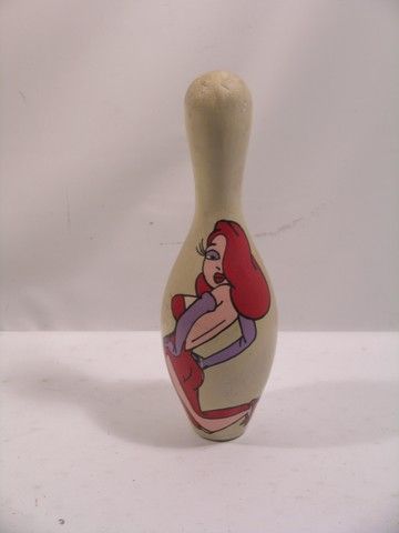 Used as décor in a Disney executive's office. This is a full scale bowling pin, with Jessica Rabbit, the seductive femme fatale from the 1988 film 'Who Framed Roger Rabbit?', painted on the front. Pin has moderate wear from being used as a decoration. (Measures approx. 5" x 5" x 14")