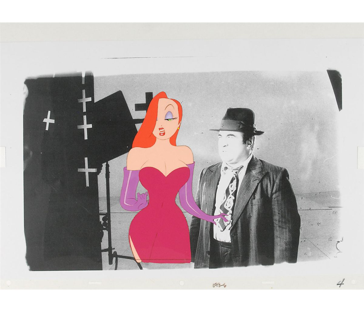 (Walt Disney Studios, 1988) Original production cel featuring Jessica Rabbit from Who Framed Roger Rabbit?, showing the curvy seductress glancing to her right. The cel is placed on a matching studio copy background that features an image of Eddie Valiant, arranged so that she is touching his tie. Image measures 5.25 x 8, with overall dimensions of 17 x 12.5. In fine condition.