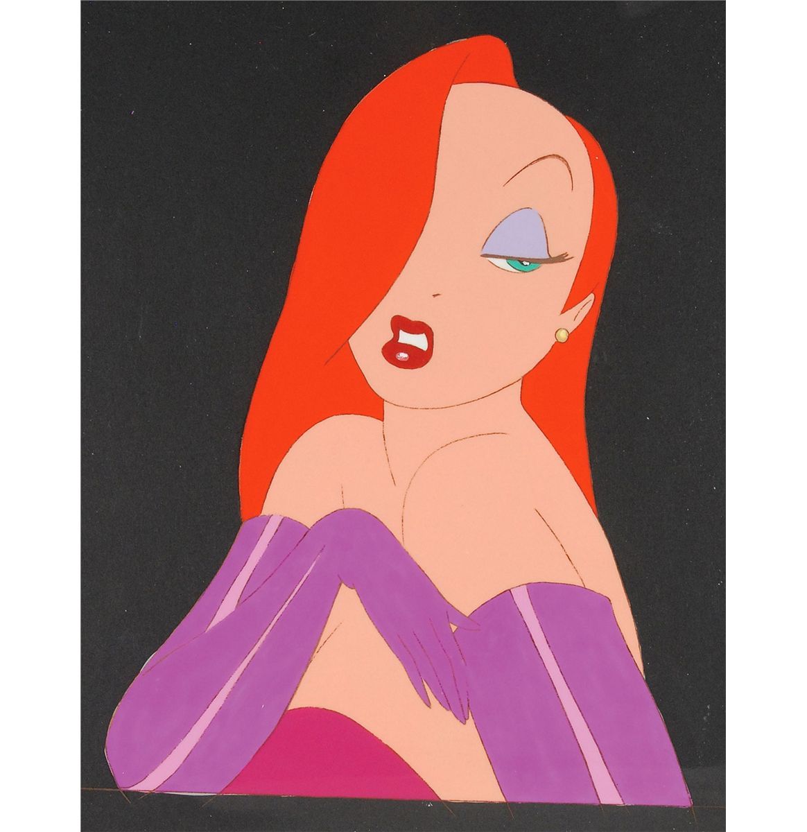 (Walt Disney Studios, 1988) Original production cel featuring Jessica Rabbit from Who Framed Roger Rabbit?, showing her with her hand across her voluminous chest. The cel is placed on a black background. Image measures 6.75 x 9, with overall dimensions of 16.75 x 13.5. In fine condition.