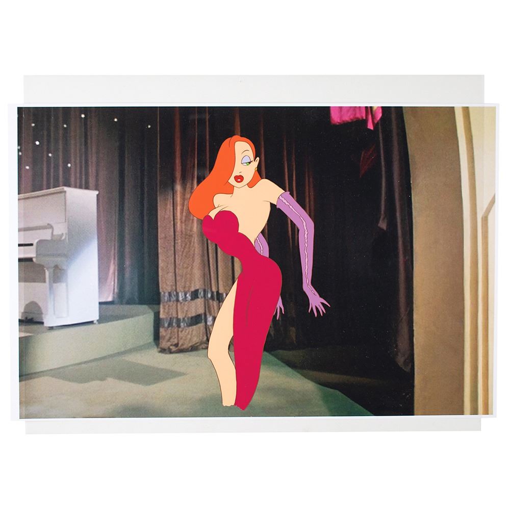 (Walt Disney Studios, 1988) Original production color model cel of Jessica Rabbit from Who Framed Roger Rabbit, depicting the voluptuous redhead in a sexy three-quarter-length pose. The cel is placed on a color Disney giclee background. Character image measures 4.5 x 9.5, with overall dimensions of 17 x 12.5. In fine condition.