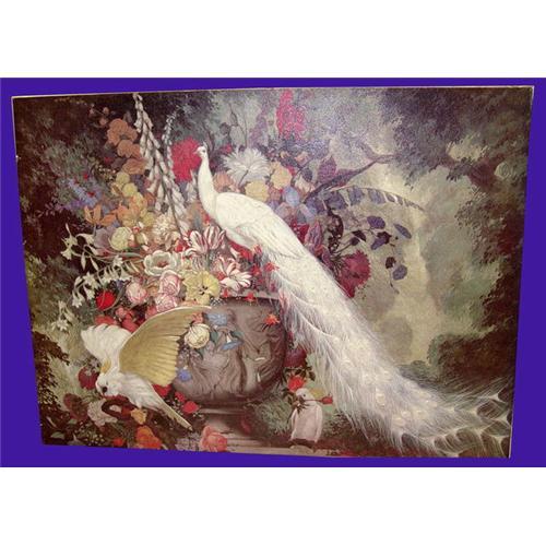 Ravishing Jessie Arms Botke 1931 graphic print mounted on board and that mounted on a stretched canvas. Exotic birds gathered about an urn of flowers. Jessie Arms Botke is heavily listed and her works are highly sought after. <P>SIZE: 32 inches x 43 inches.
