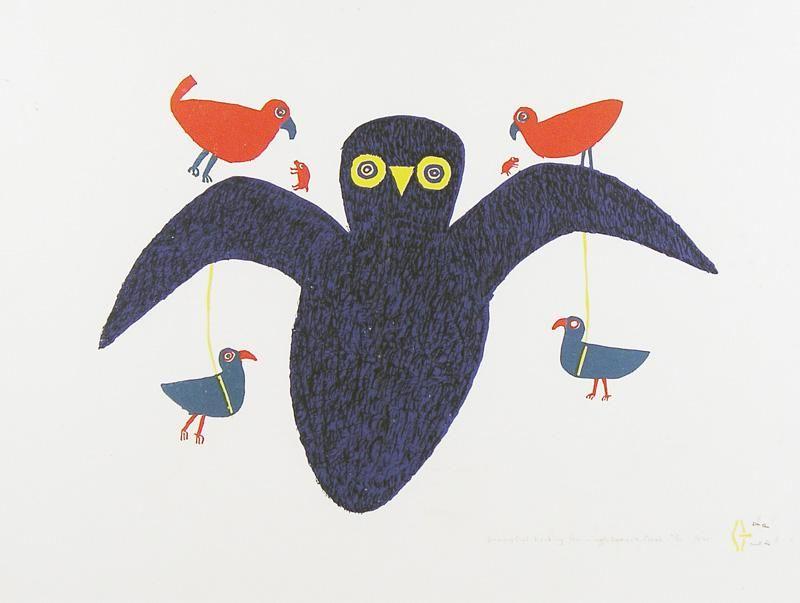 Canadian, Baker Lake RCA [1906-1985] SNOWY OWL HUNTING LEMMINGS; 1975 colour serigraph on paper; ed. #43/50 16.5 x 22 in. (41.9 x 55.9 cm) signed, titled, dated & editioned