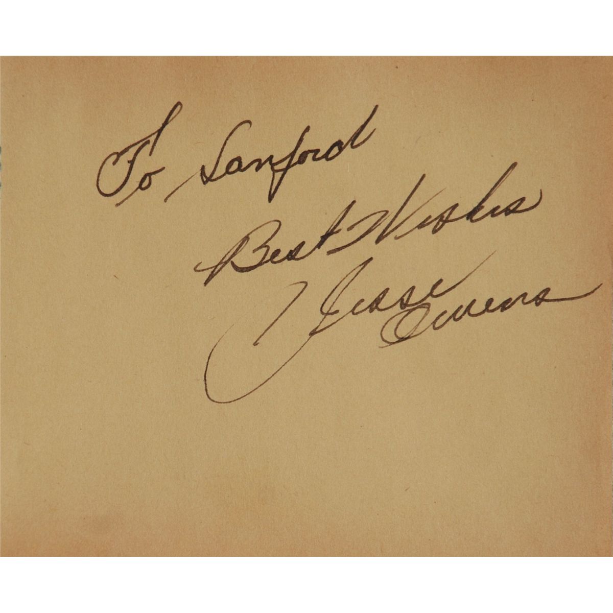 Nice vintage signature on album page signed by "To Sanford Jesse Owens". Owens was an American track and field athlete and four-time Olympic gold medalist.Owens specialized in the sprints and the long jump and was recognized in his lifetime as "perhaps the greatest and most famous athlete in track and field history".