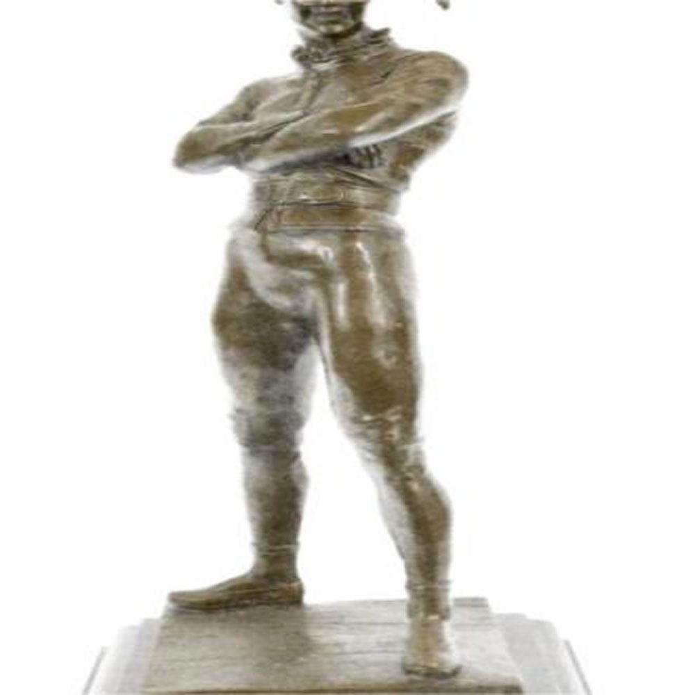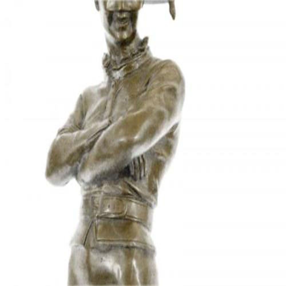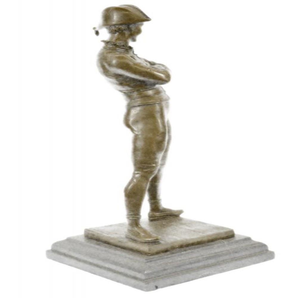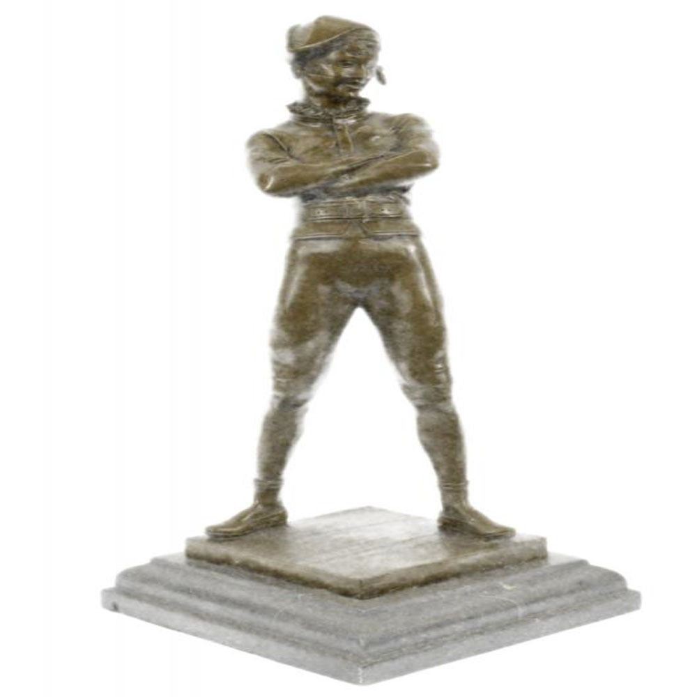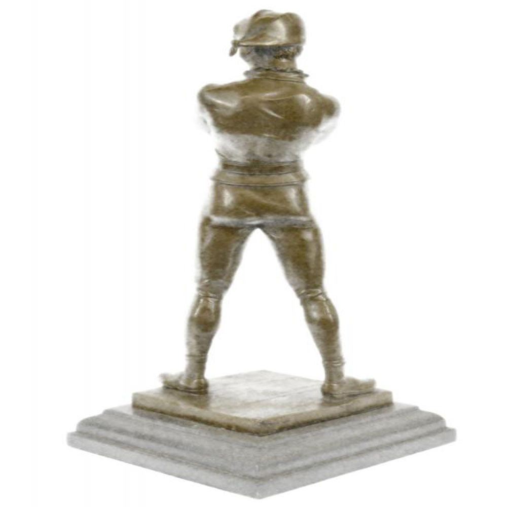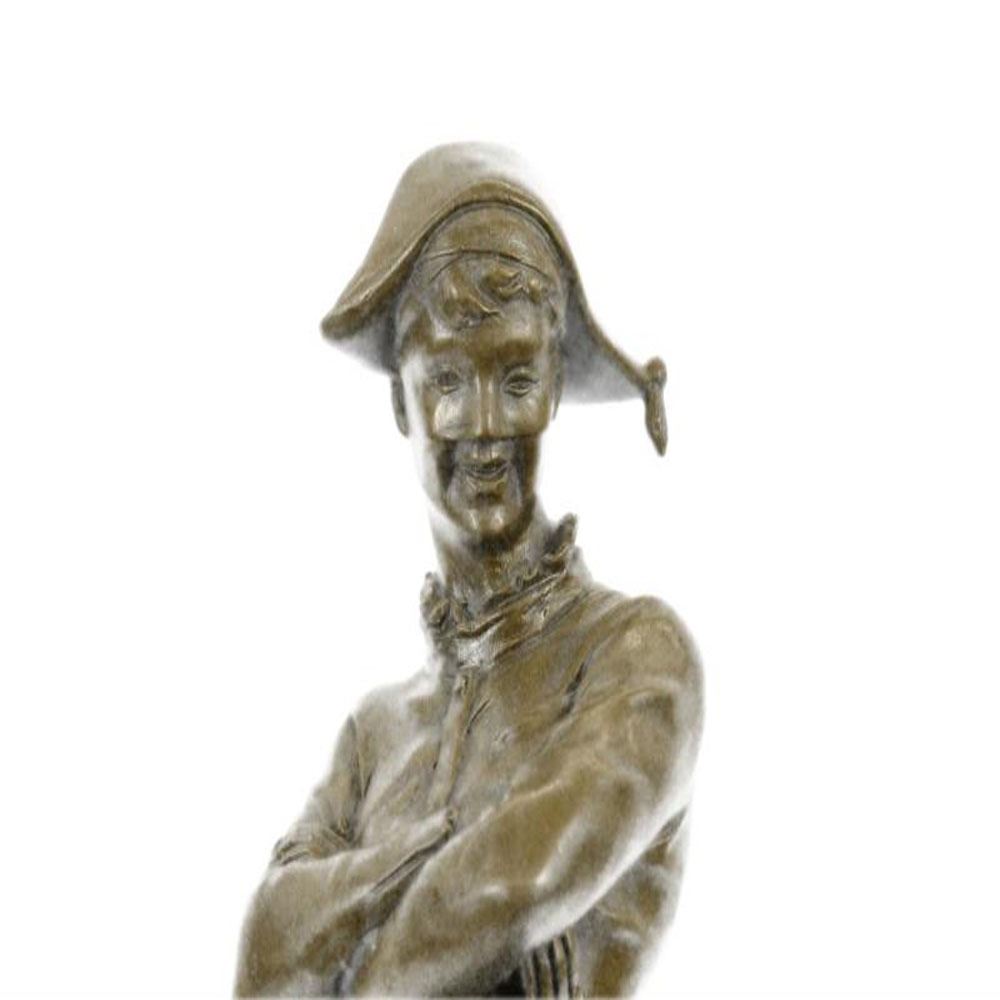 Bronze Harlequin figure, the figure modeled standing with arms crossed, and mounted a top square marble base rich brown palliation. This Sculpture was cast using the Lost Wax Method and has a brown patina and is mounted on a marble base. Bronze Dimensions with Marble Base: Height 17 X Width 7 inches. Weight: 18 LBS.
