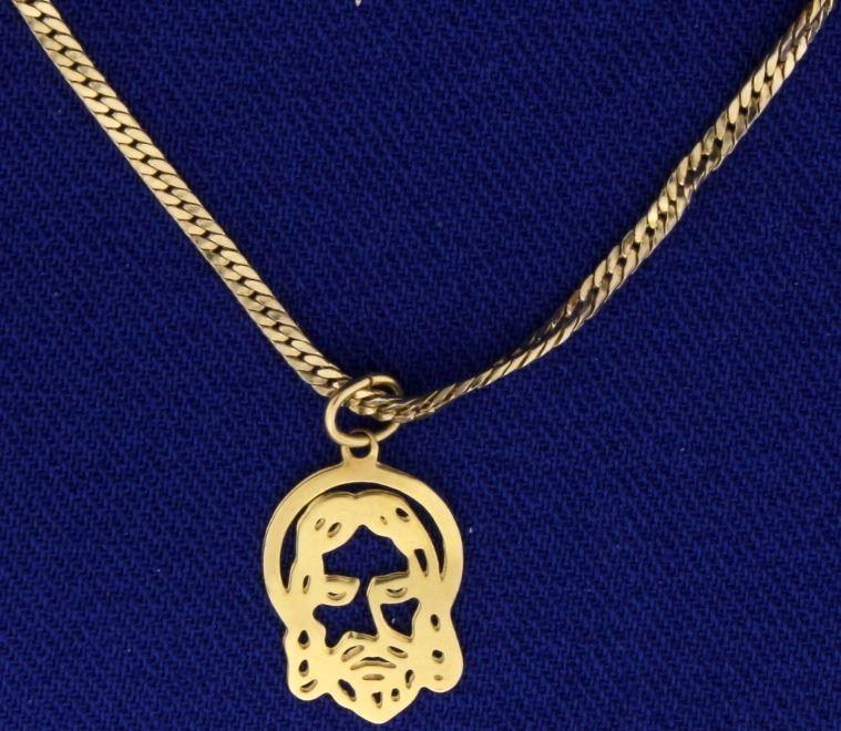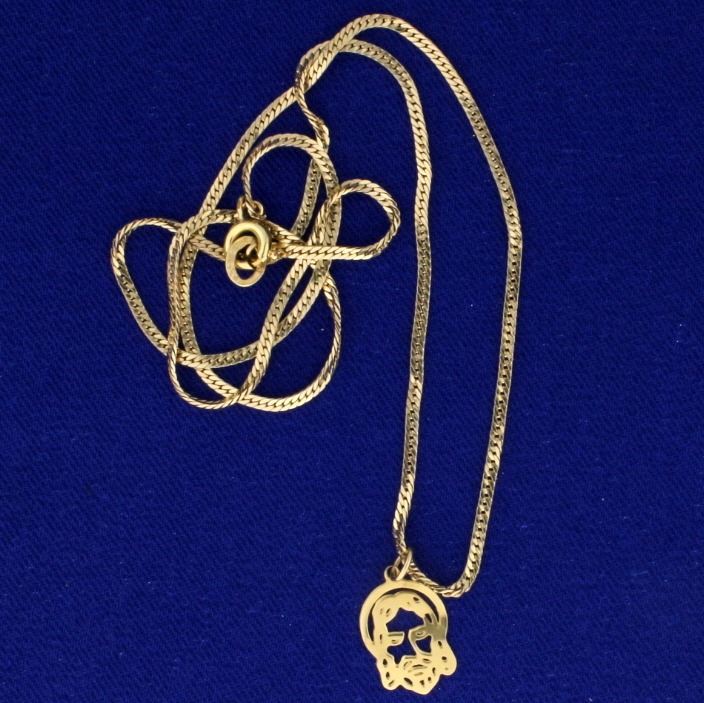 In 14k yellow gold. 11/16 Inch pendant. 16 3/4" flat link chain, 2.6mm thick. 2.3g.