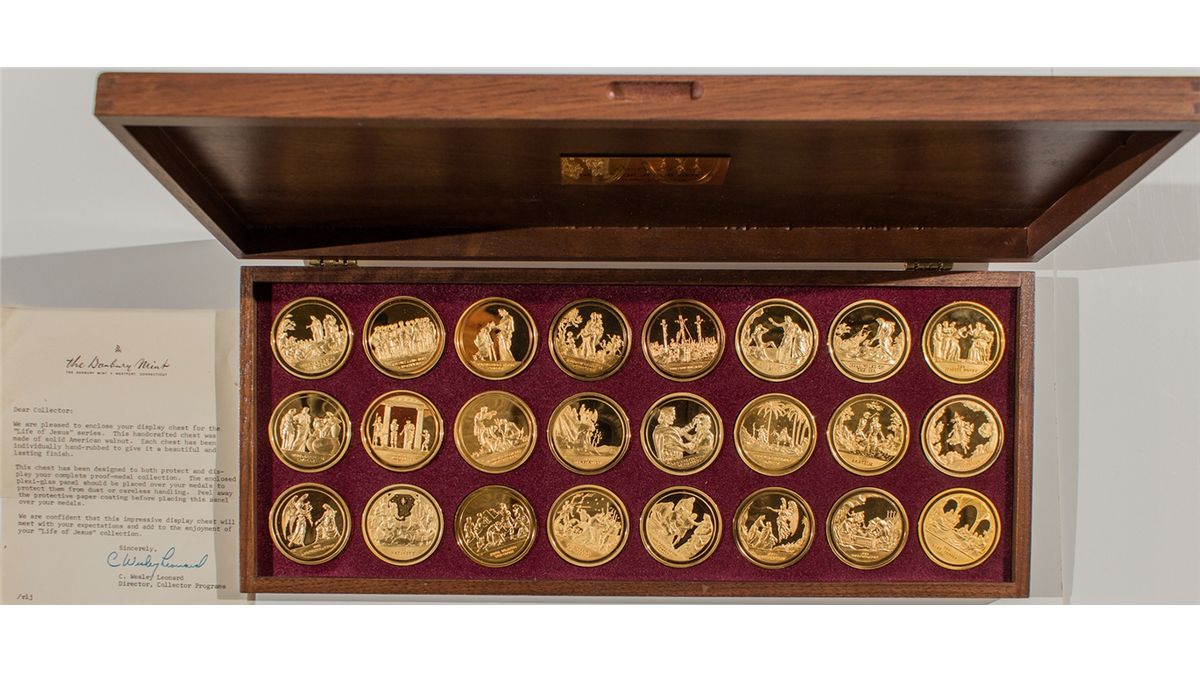 c1972 Gold plated 24-coin proof set from the Danbury Mint, entitled "The Life of Jesus Series." All are in mint condition, are gold electroplated Sterling Silver and weigh 1.60 troy oz. each. Comes in a wood display box. Gordon Harris Estate - HKA#65988