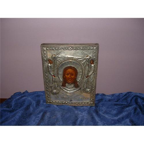 This finely detailed Jesus icon is hand painted on wood, with a very ornate silver plate overlay. There is an angel on each side of Jesus.