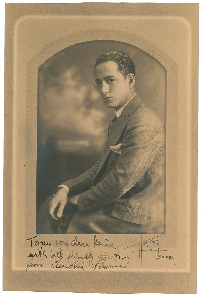 Vintage matte-finish 6 x 8.75 seated portrait of Sanroma by Horner of Boston, signed and inscribed in the lower border in fountain pen, “To my dear Renee, with all friendly affection from ‘Chuchu’ Sanroma, XXVII.” Also signed in the lower right by the photographer. In fine condition, with lightly trimmed borders.