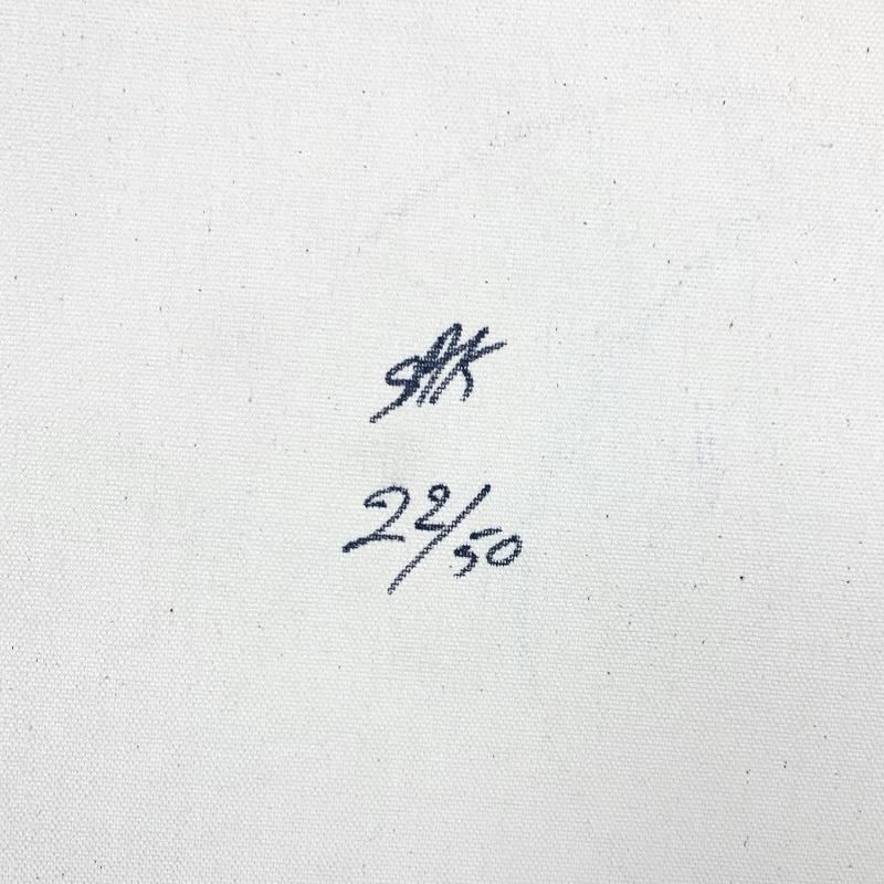 "Jesus" is a limited edition hand pulled silkscreen unique mixed media on canvas by Andy Warhol protege Steve Kaufman (1960-2010). This piece is numbered and hand signed inverso and includes a letter of authenticity. As is common with Kaufman's works, this piece may have perceived minor flaws including some smudges and marking in the border, but is in overall good condition. Measures approximately 27.5" x 23" before cropping.