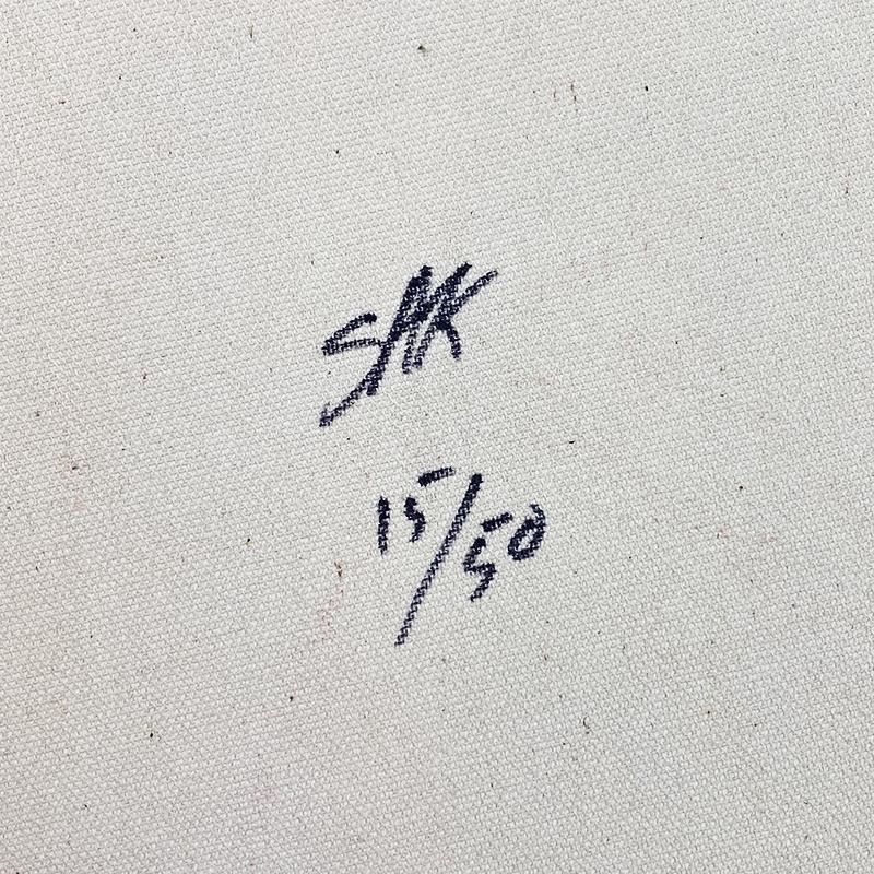 "Jesus Peace State Two" is a limited edition hand pulled silkscreen mixed media on canvas by Andy Warhol protege Steve Kaufman (1960-2010). This piece is numbered and 15/50 and hand signed inverso. Includes letter of authenticity. As is common with Kaufman's works, this piece may have perceived minor flaws and does have some creases. Measures approximately 30" x 28" (image).