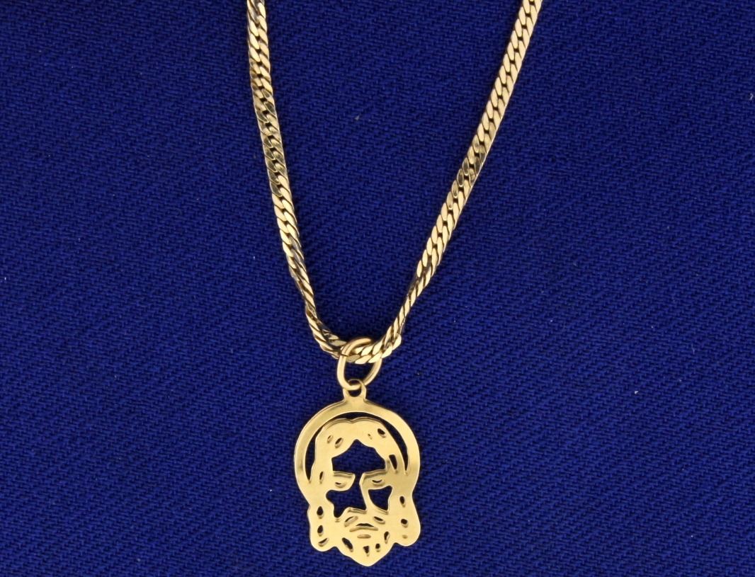 Pendant is 14k slid yellow gold, chain is plated 14k yellow gold. Pendant is 1 1/6"in diameter. Chain is 16 3/4" flat link chain, 2.6m wide. 2.3g.