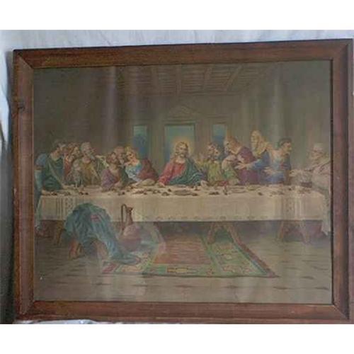 Print of the Lord's Supper or the Last Supper showing Jesus and the 12 disciples. The picture including the wood frame measures 22.25 inches wide and 18.25 inches tall. This Last Supper print is in very good condition.