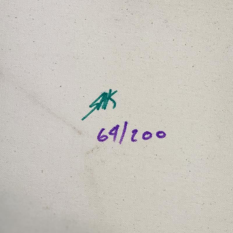 "Jesus in Thorns state 1" is limited edition hand pulled silkscreen unique mixed media on canvas by Andy Warhol protege Steve Kaufman (1960-2010). This piece is numbered and hand signed inverso and includes a letter of authenticity. As is common with Kaufman's works, this piece may have perceived minor flaws, but is in overall good condition. Measures approximately 25" x 18" before cropping.