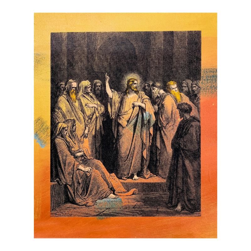 "Jesus in the Temple" is limited edition hand pulled silkscreen unique mixed media on canvas by Andy Warhol protege Steve Kaufman (1960-2010). This piece is numbered and hand signed inverso and includes a letter of authenticity. As is common with Kaufman's works, this piece may have perceived minor flaws, but is in overall good condition. Measures approximately 17.25" x 13.25" before cropping.