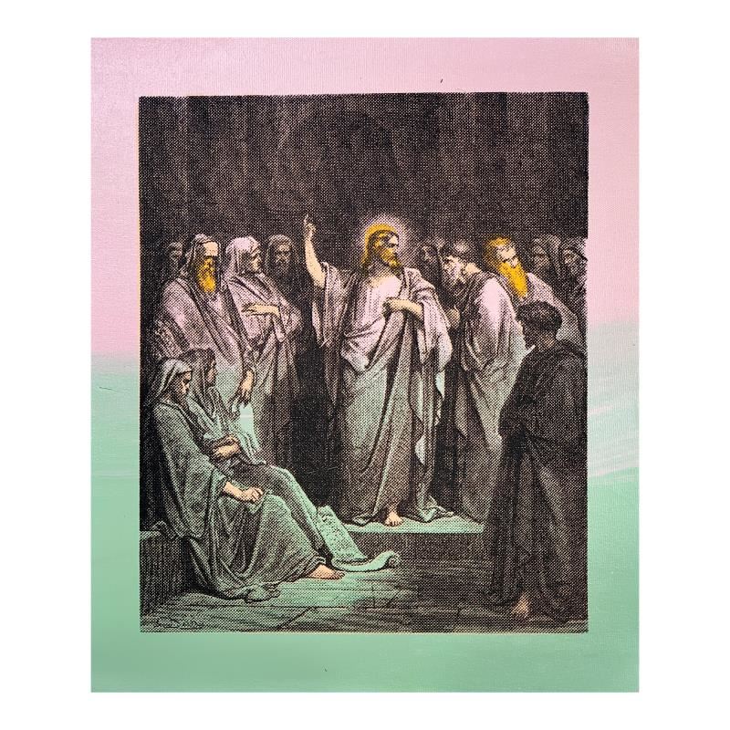 "Jesus in the Temple" is limited edition hand pulled silkscreen unique mixed media on canvas by Andy Warhol protege Steve Kaufman (1960-2010). This piece is numbered and hand signed inverso and includes a letter of authenticity. As is common with Kaufman's works, this piece may have perceived minor flaws, but is in overall good condition. Measures approximately 17.25" x 13.25" before cropping.