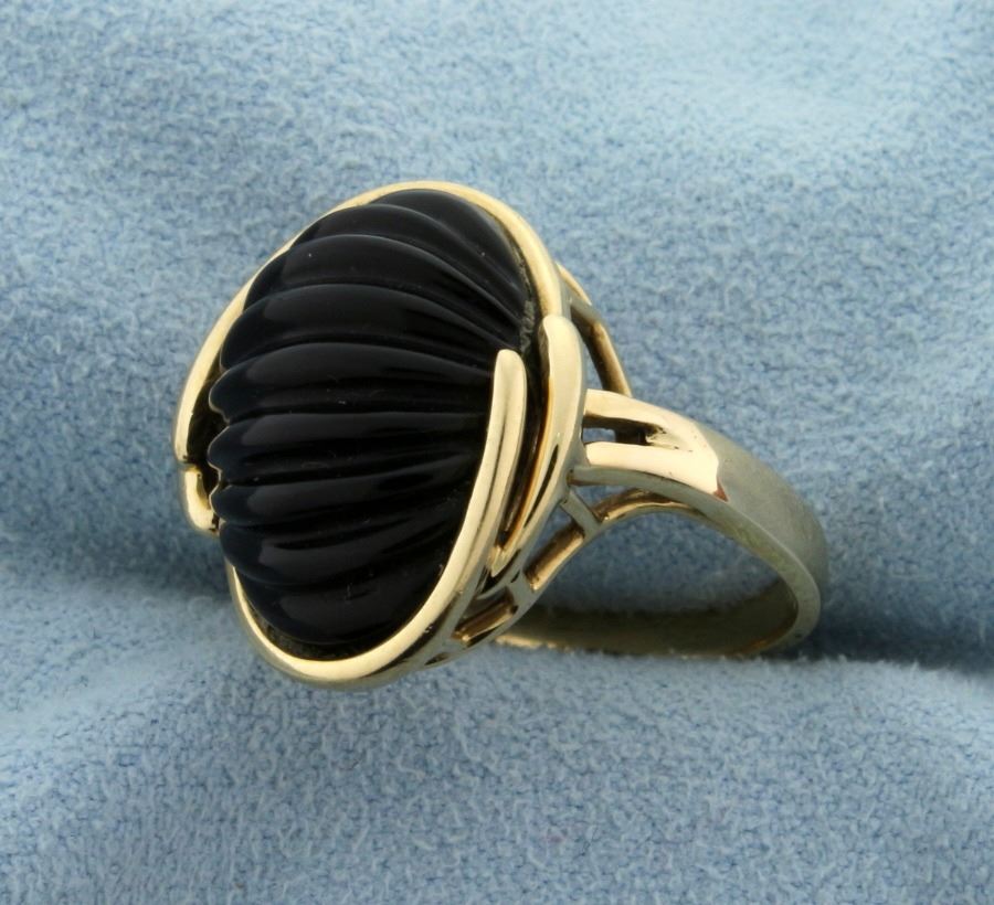 In 14k yellow gold, with a unique cut jet gemstone. Size 6 1/4. 6.5g.