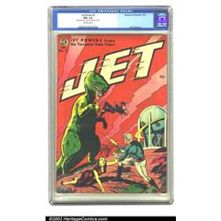 Jet Powers #2 (Magazine Enterprises, 1951) CGC FN+ 6.5 Off-white pages. Bathed in red, this cover depicts a hungry dinosaur about to chow down on his victim, as Jet tries to interrupt dinner. Corner wear keeps this book in the FN category, yet the cover gives a much nicer appearance in the case. Overstreet 2002 FN 6.0 value = $72. Important notice: We expect to be auctioning lots at the rate of 200-250 per hour. Sometimes eBay Premier live bid software cannot keep up with that pace, so we strongly recommend that you place a realistic proxy bid now as insurance to avoid disappointment. Also please note that all Heritage/CAA lots purchased through eBay Premier carry a 20% Buyer's Premium. Please make sure you read the Terms and Conditions.